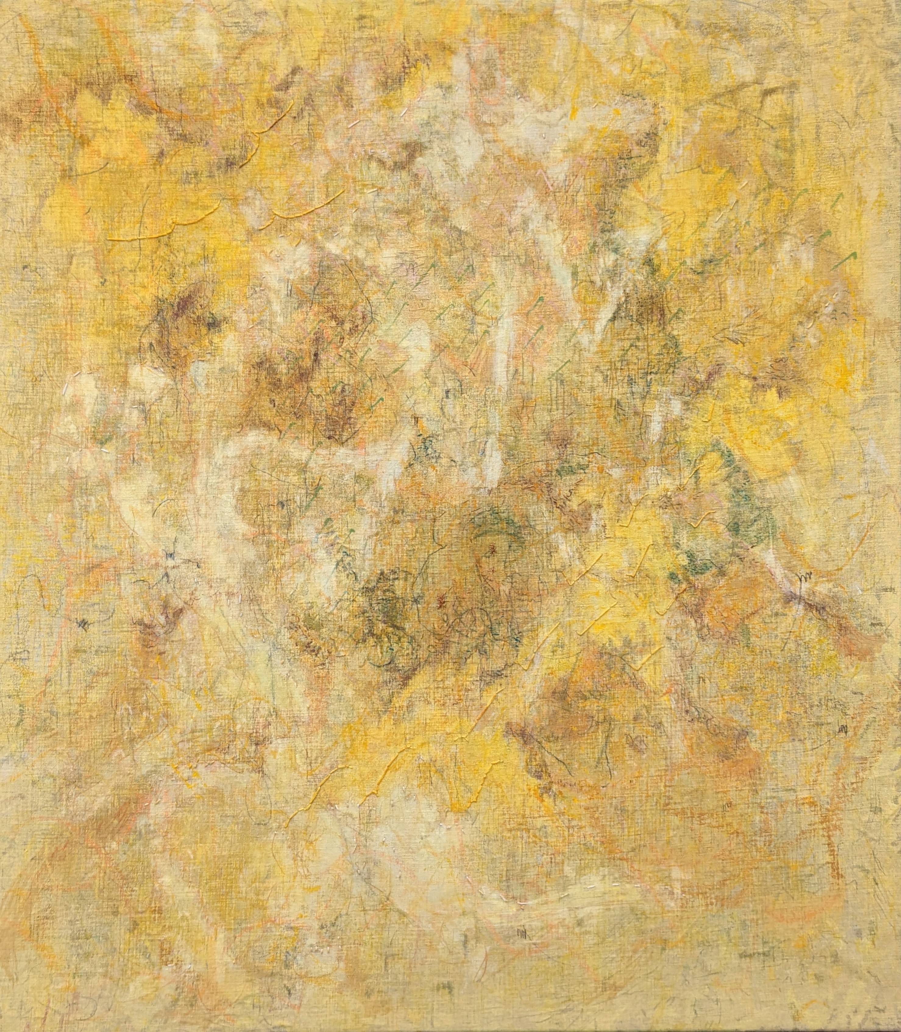 Trassling, 2024. Acrylic, oil, chalk, pastel, pencil, and thread on canvas, 81.5x71cm