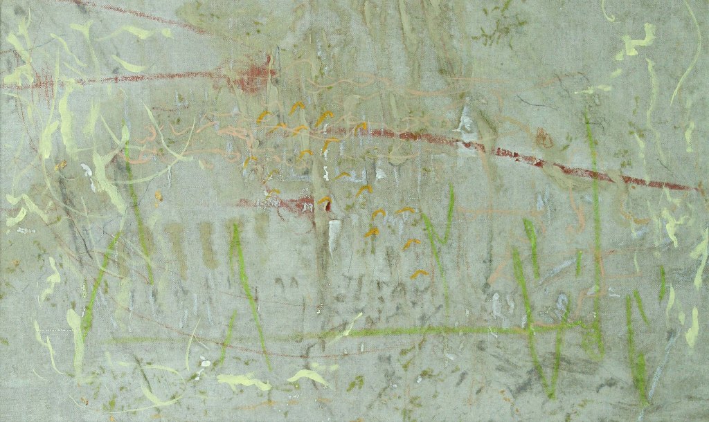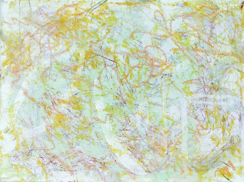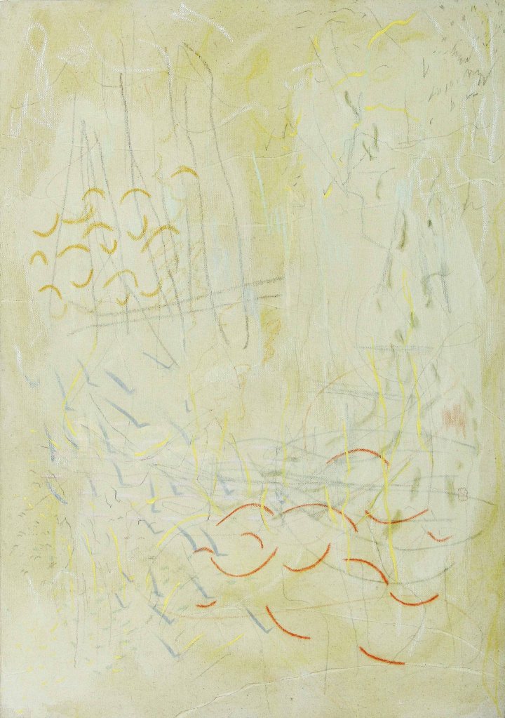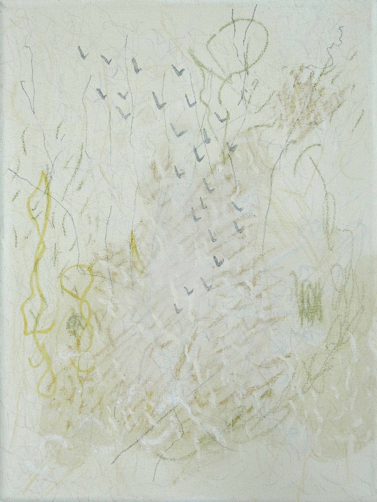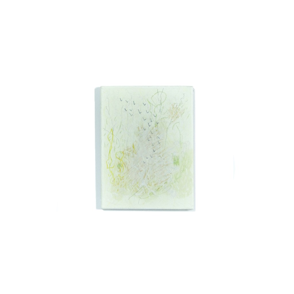 Cirrus weaver, 2023. Acrylic, oil, chalk, pastel, and pencil on canvas, 34.2×41.9cm