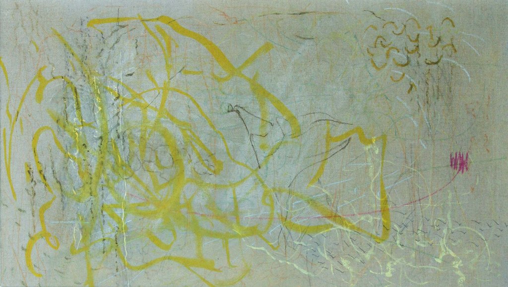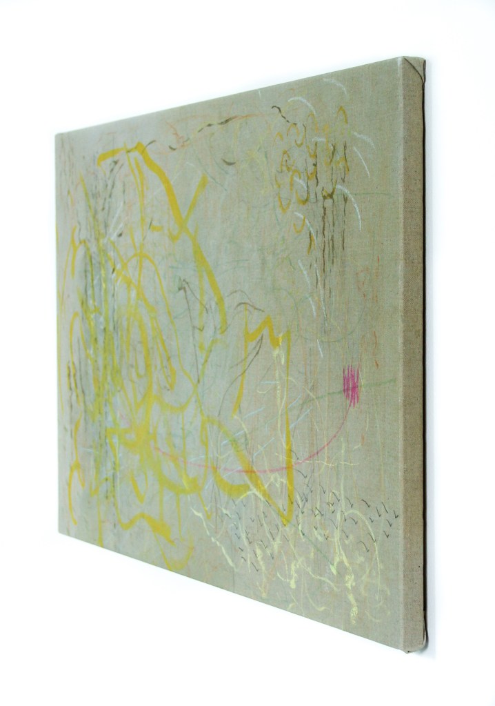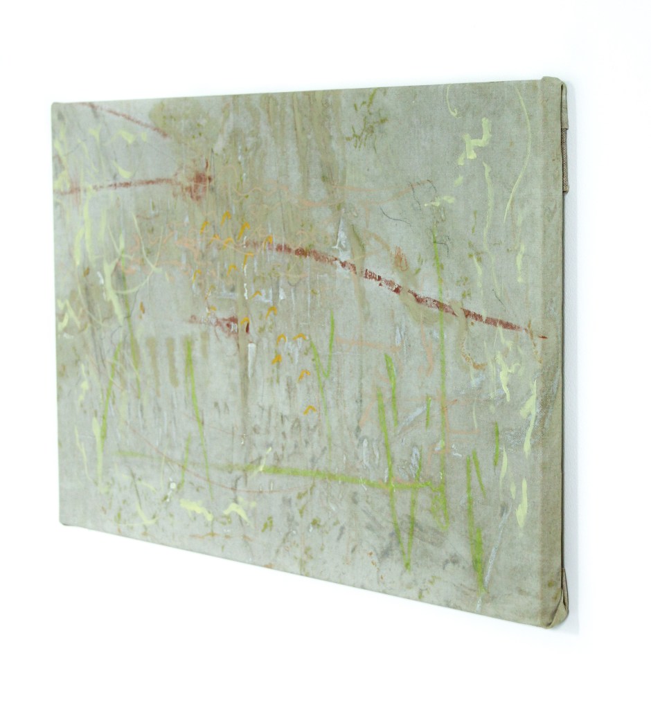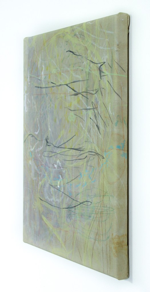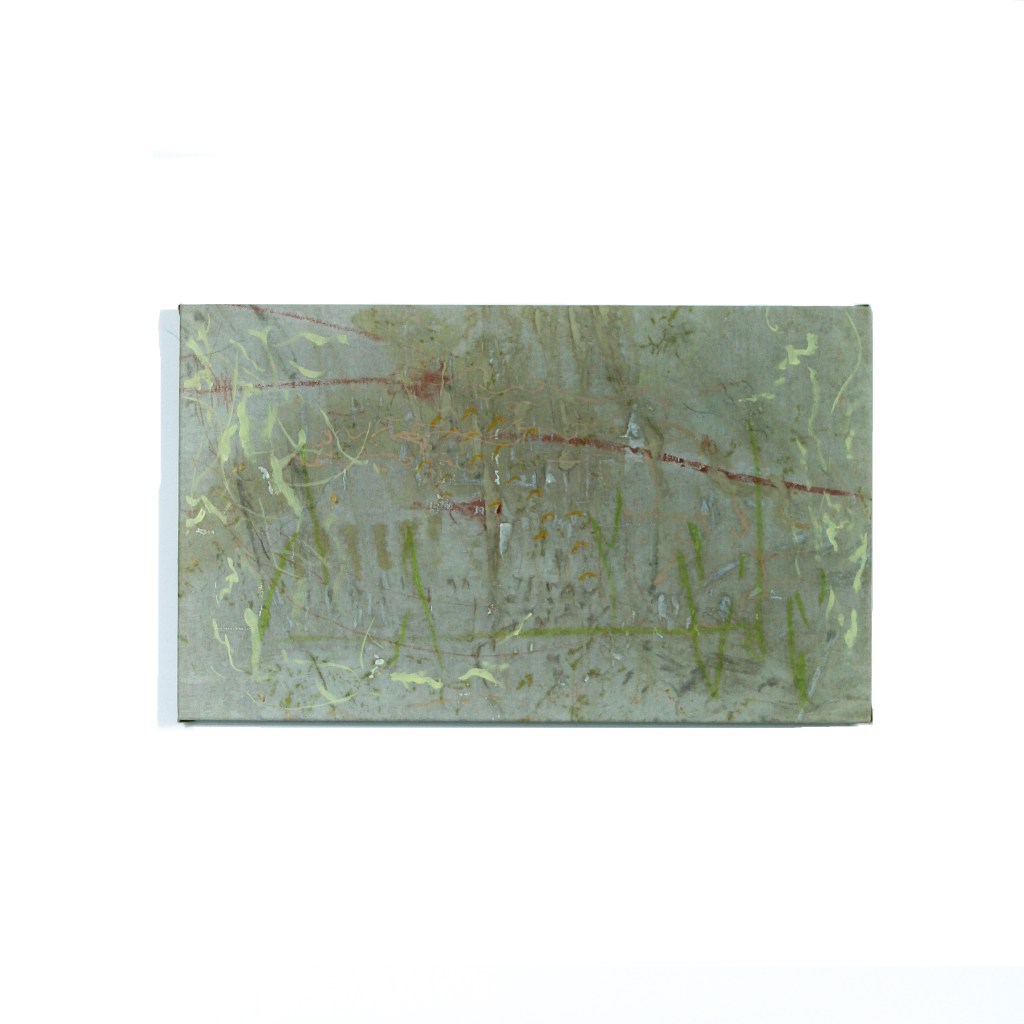 Ymgolli, 2023. Acrylic, oil, chalk, pastel, and pencil on canvas, 16×26.9cm