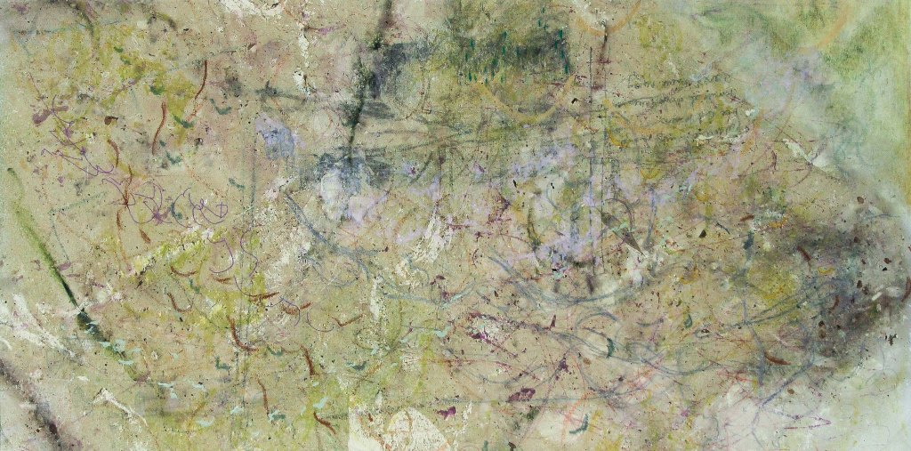 Tippi-Weamod, 2024. Acrylic, oil, chalk, pastel, pencil, and thread on canvas, 50x100cm