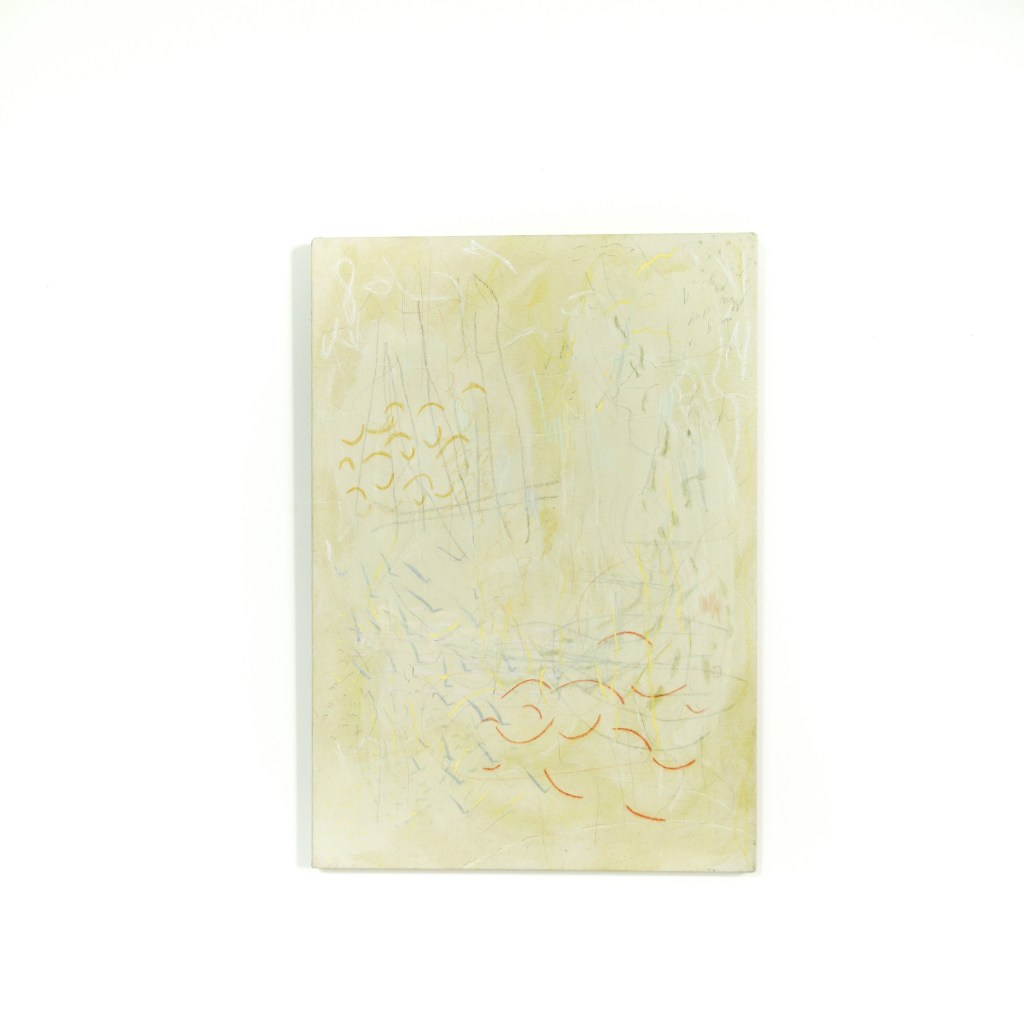 Lyre, 2023. Acrylic, oil, chalk, pastel, and pencil on canvas, 22.8×30.4cm