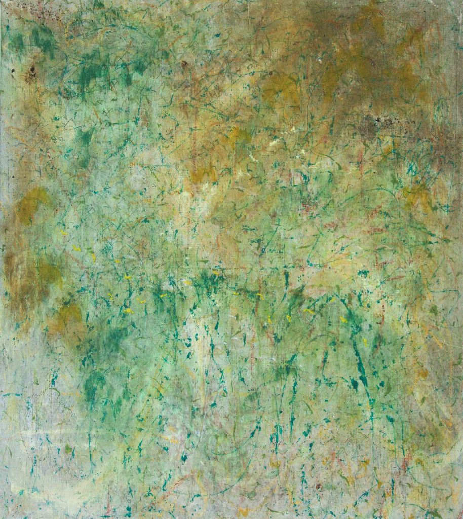 Mucs, 2024. Acrylic, oil, pastel, pencil and bark on canvas, 82×91.5cm