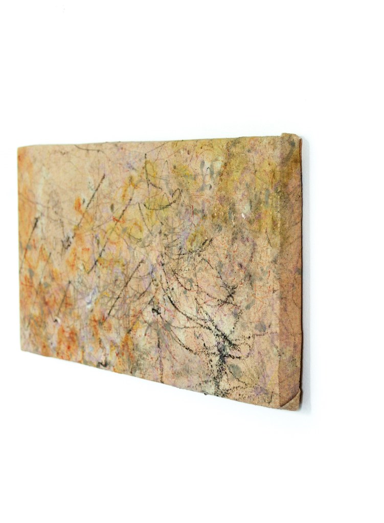 Mulching, (2024). Acrylic, oil, pastel, pencil, and bark on canvas, 35x50cm